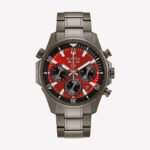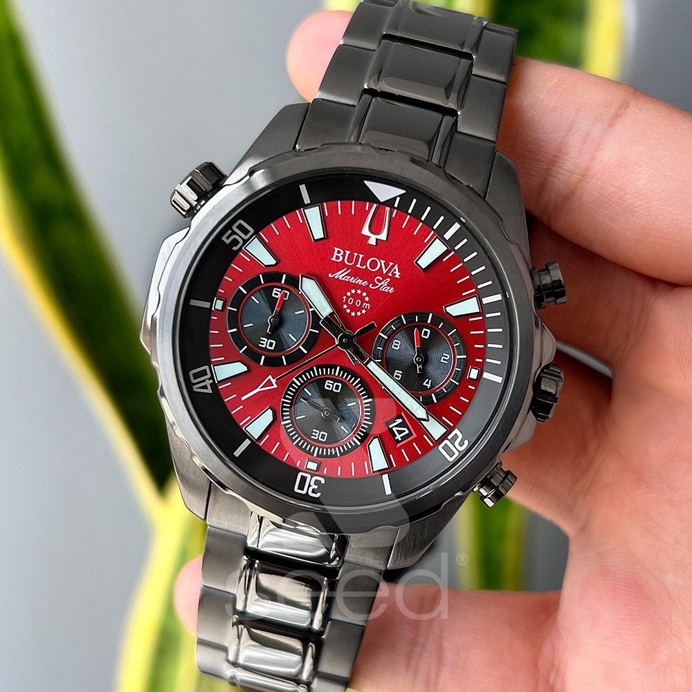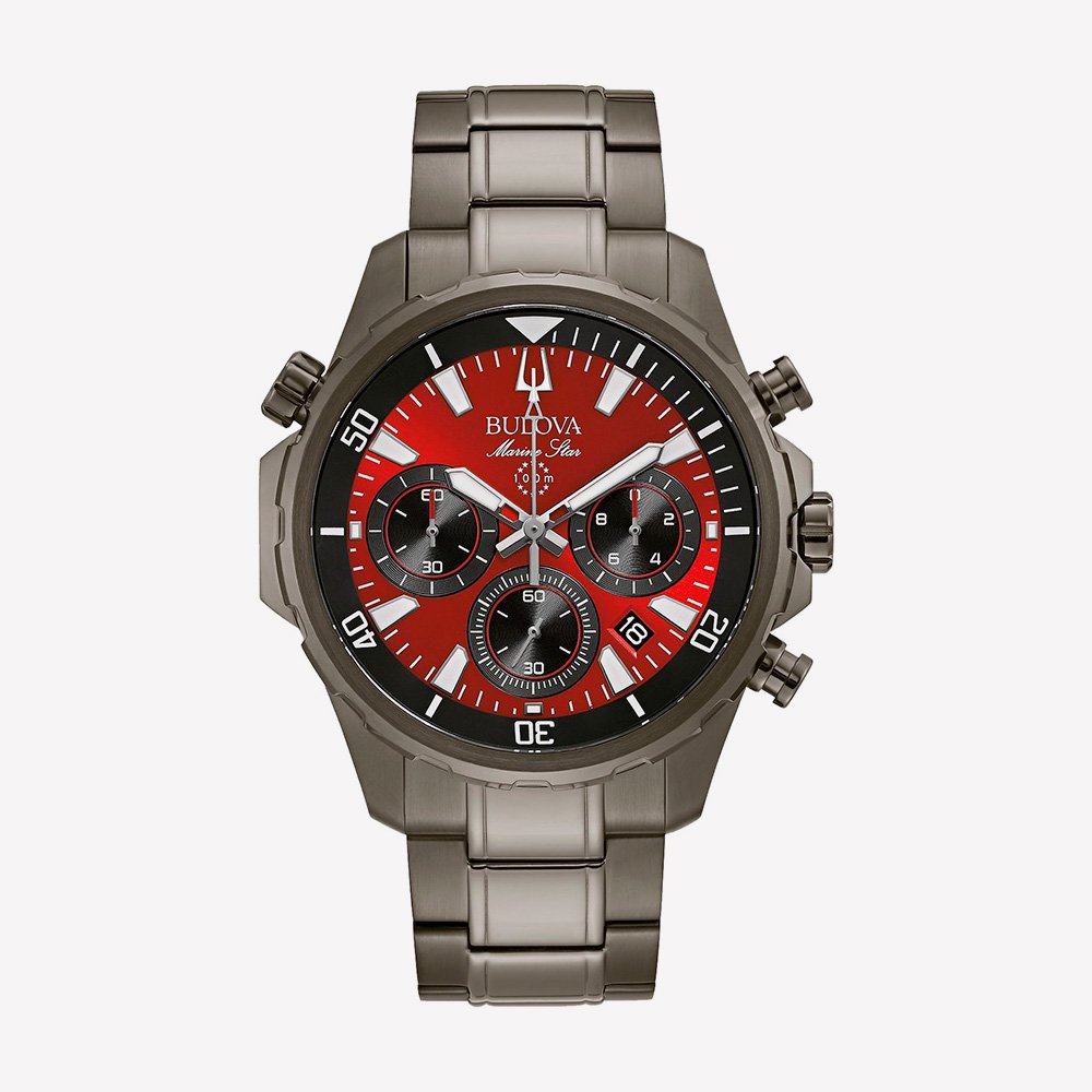 Descubre el Bulova Marine Star 98B350, un reloj que combina estilo y rendimiento en una pieza sofisticada. Su imponente caja de acero inoxidable con acabado gris ionizado resalta una esfera roja vibrante, símbolo de fuerza y elegancia. Ideal para quienes buscan un reloj que imponga presencia y resista cualquier desafío.